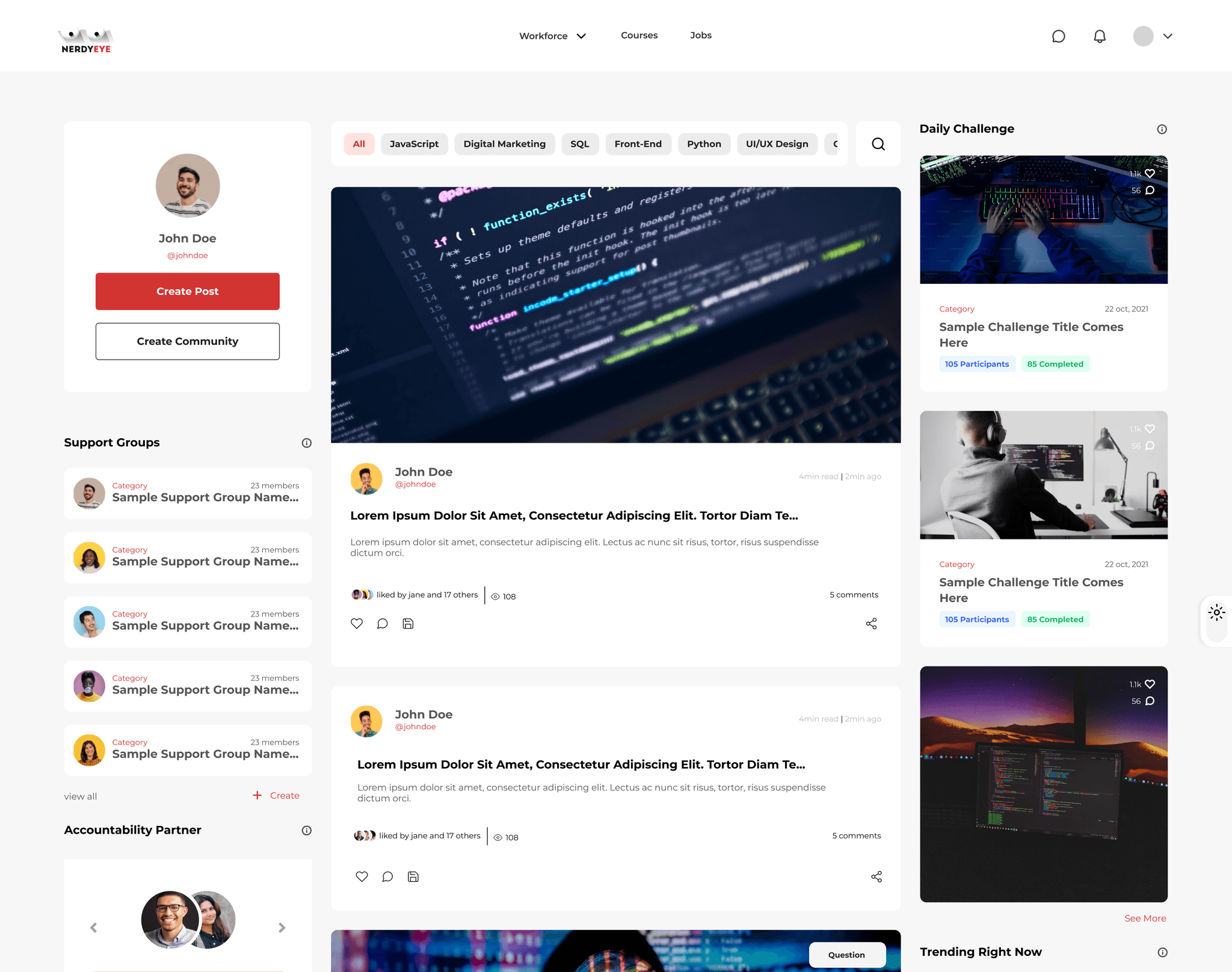 Community page where students can chat with like-minded individuals, find an accountability partner and also join support groups.