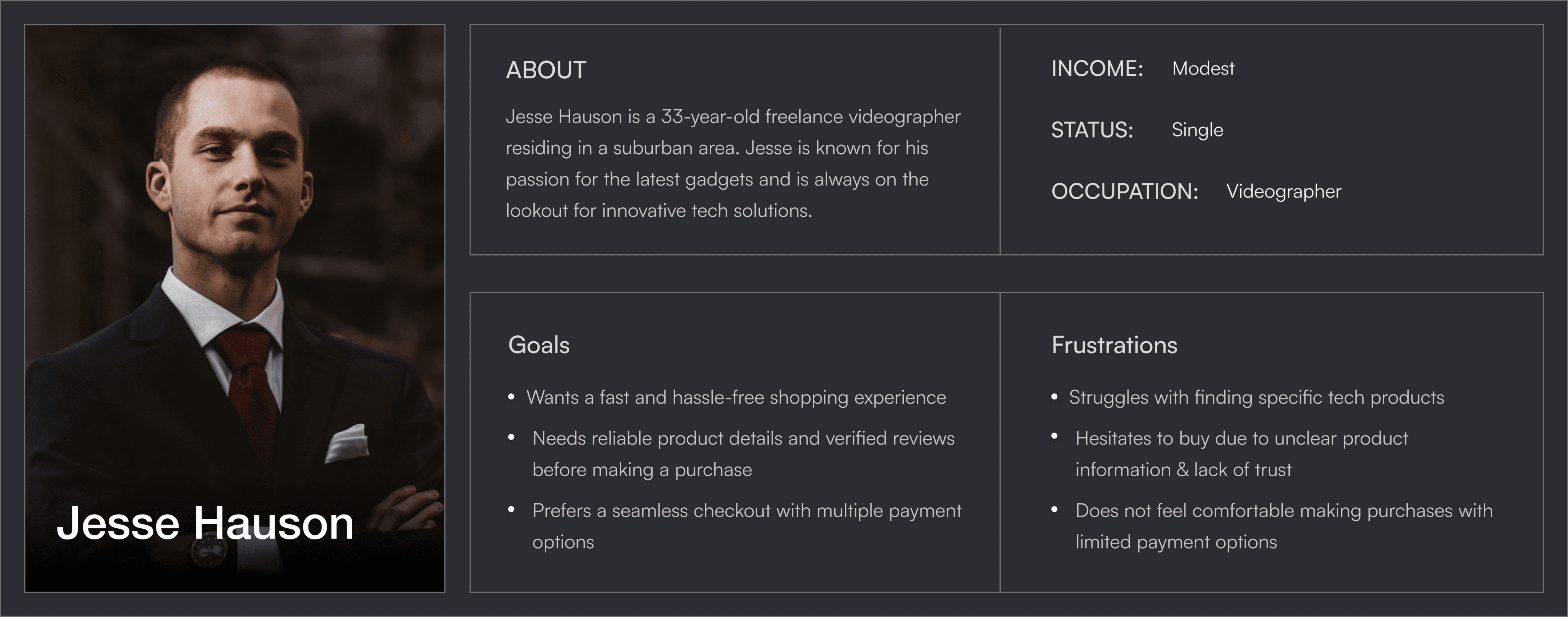 Jesse Hauson came to life from background research and my user interviews. He served as a reference point throughout the rest of the project, ensuring the user remained at the forefront of my design process.