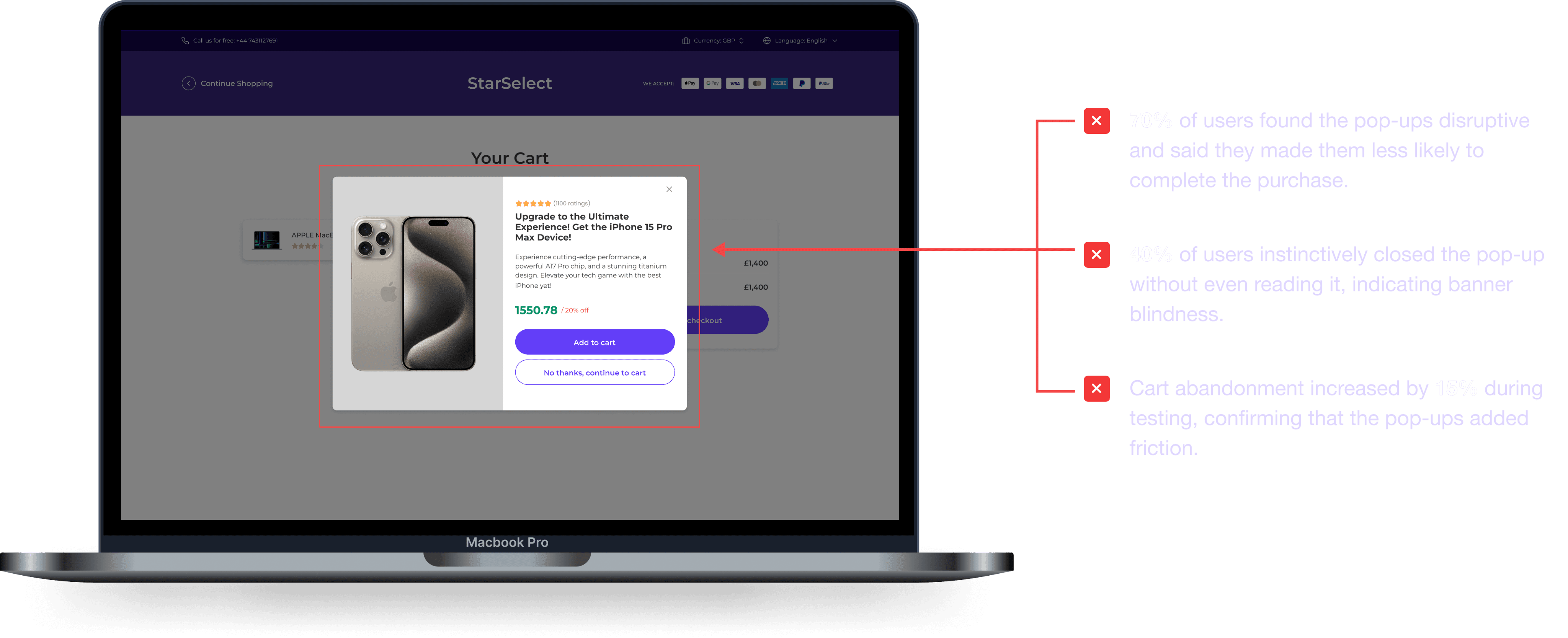 After finalising the high-fidelity UI designs, there was a shift in business priorities. Stakeholders wanted to introduce pop-ups at checkout to promote high-margin products and increase average order value. While this made sense from a revenue perspective, I was concerned about its impact on the user experience.