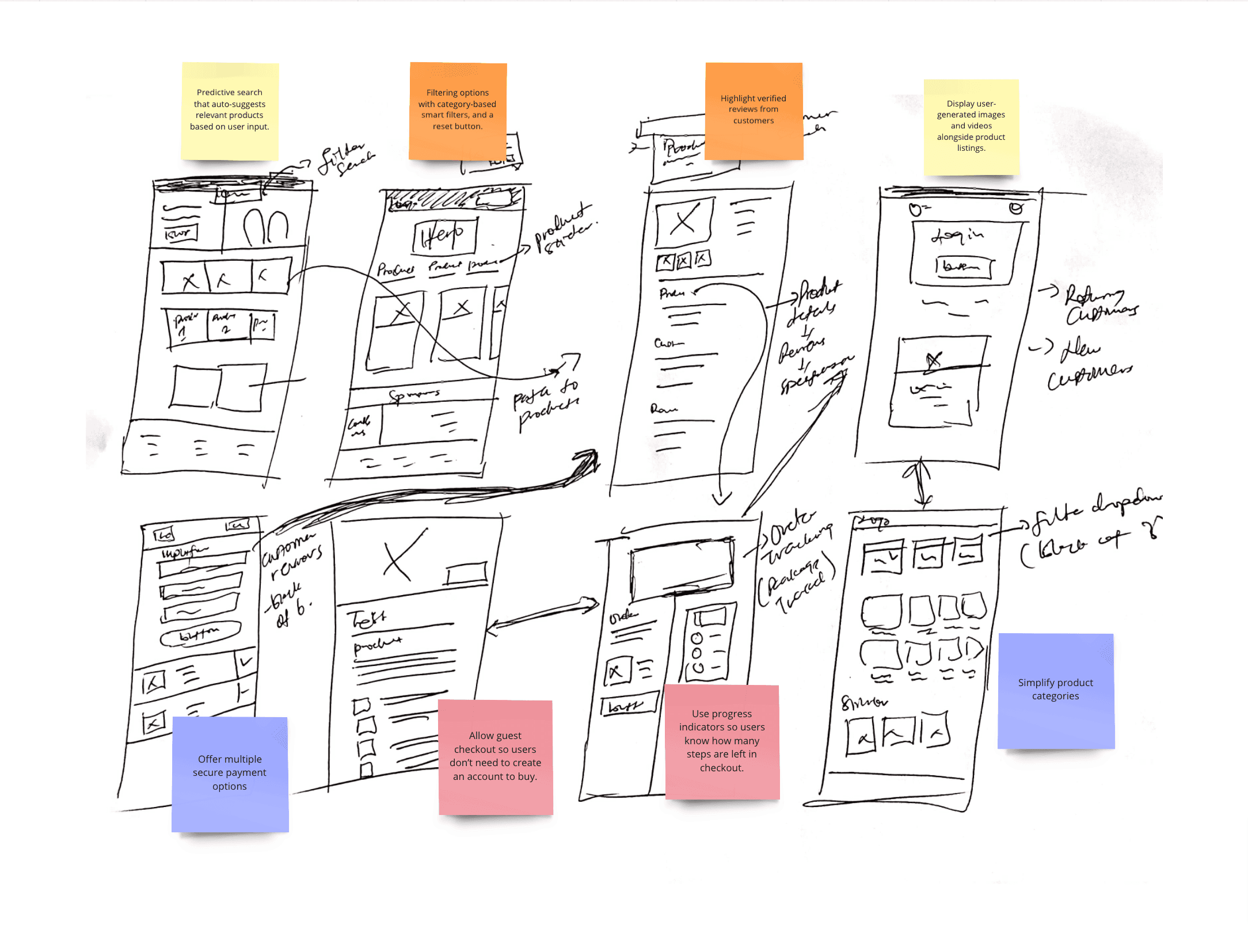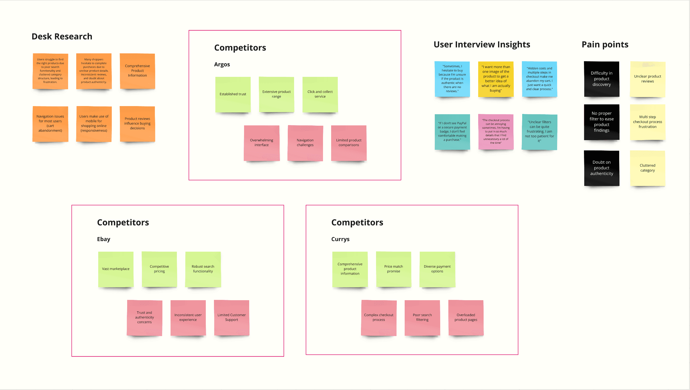 I organised all the feedback from users on miro, grouping similar frustrations and needs together. This process helped me step back and see patterns emerge. What users were struggling with the most, what mattered to them when shopping for tech gadgets, and where existing platforms were falling short.