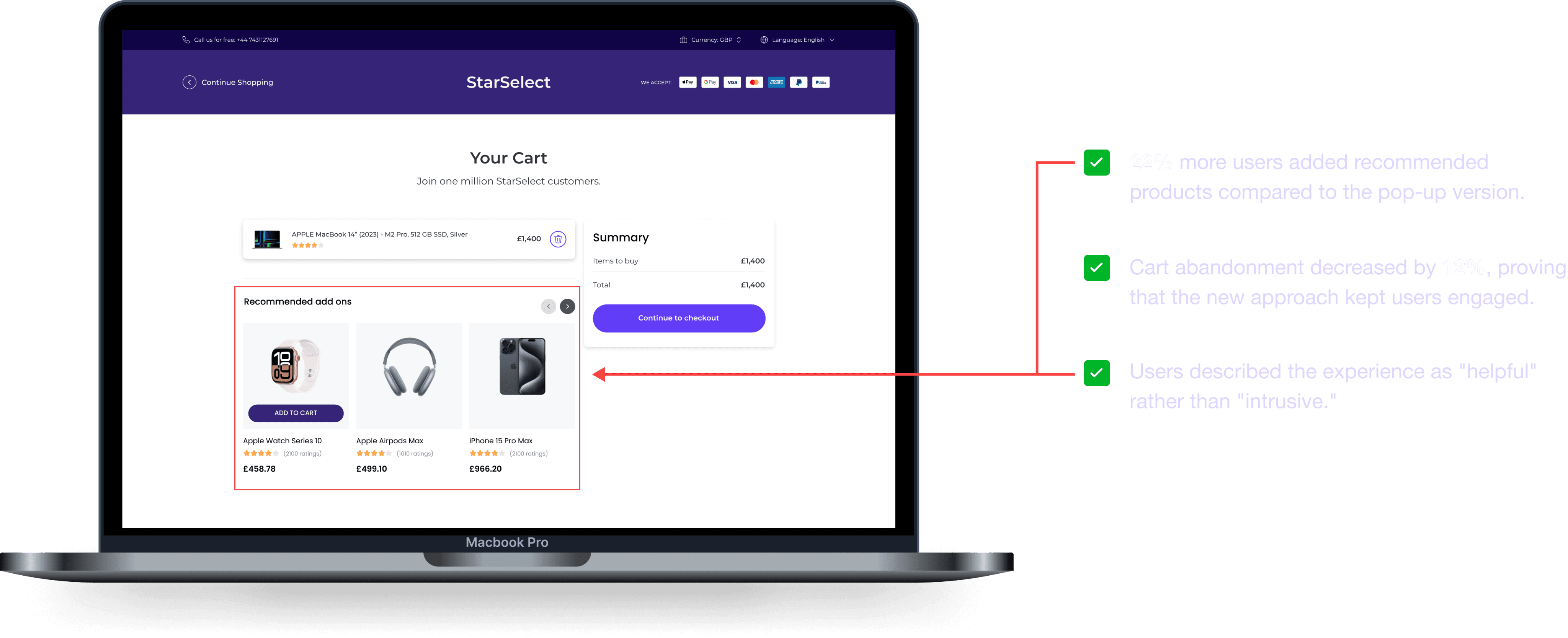 After presenting the usability report to the project manager, I proposed embedding a "Recommended Add-Ons" section directly on the checkout flow rather than pop ups.